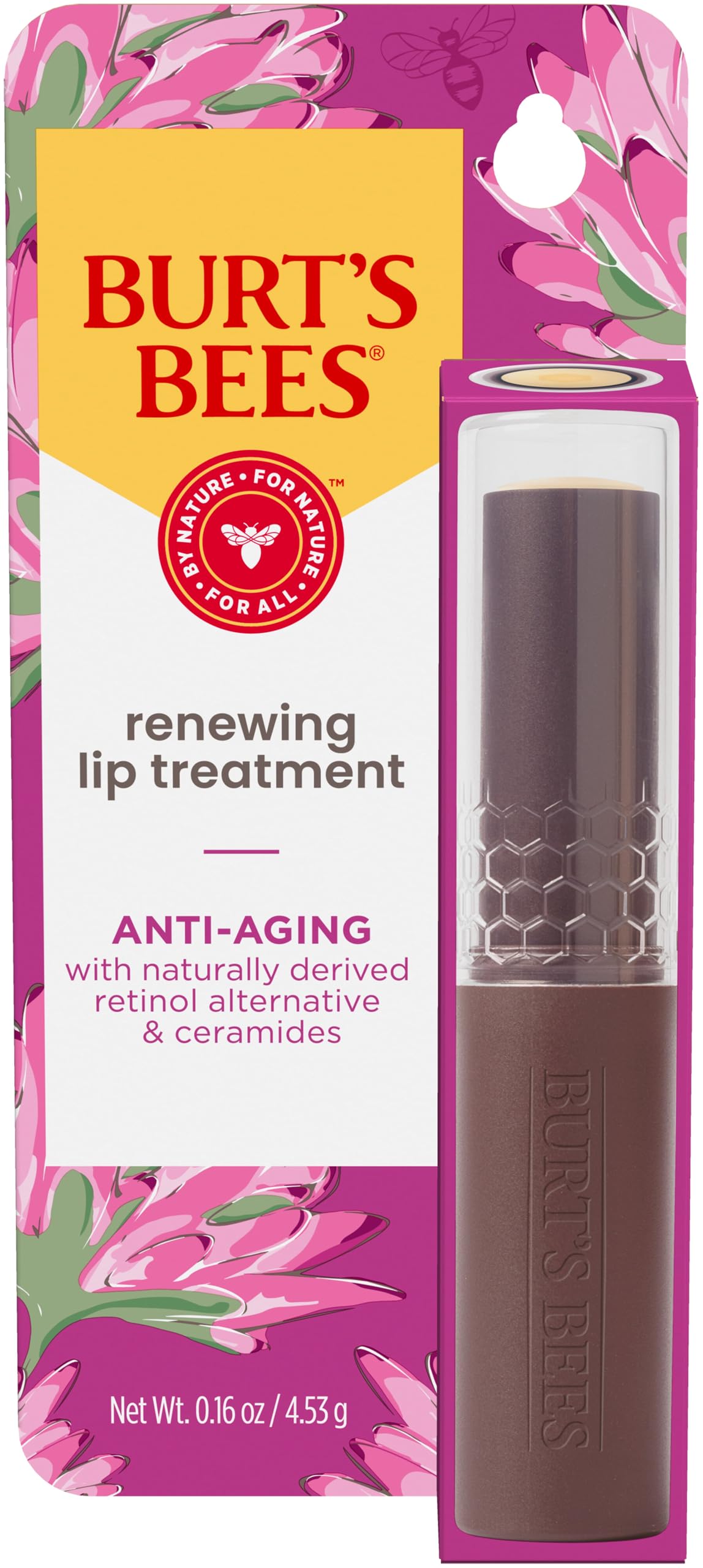 Burt’s Bees Renewing Lip Treatment offers instant hydration thanks to its ceramide-rich core, which keeps lips moisturized and protected against dryness all day.
